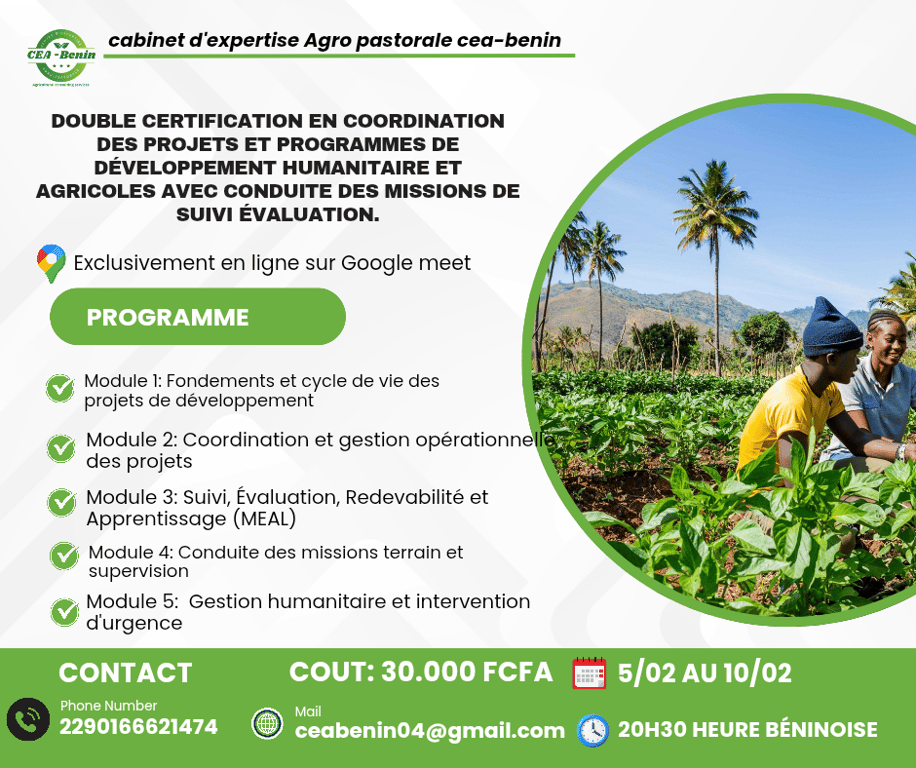 FORMATION EN COORDINATION DES PROJETS DE DÉVELOPPEMENT AGRICOLE ET PROGRAMME HUMANITAIRE